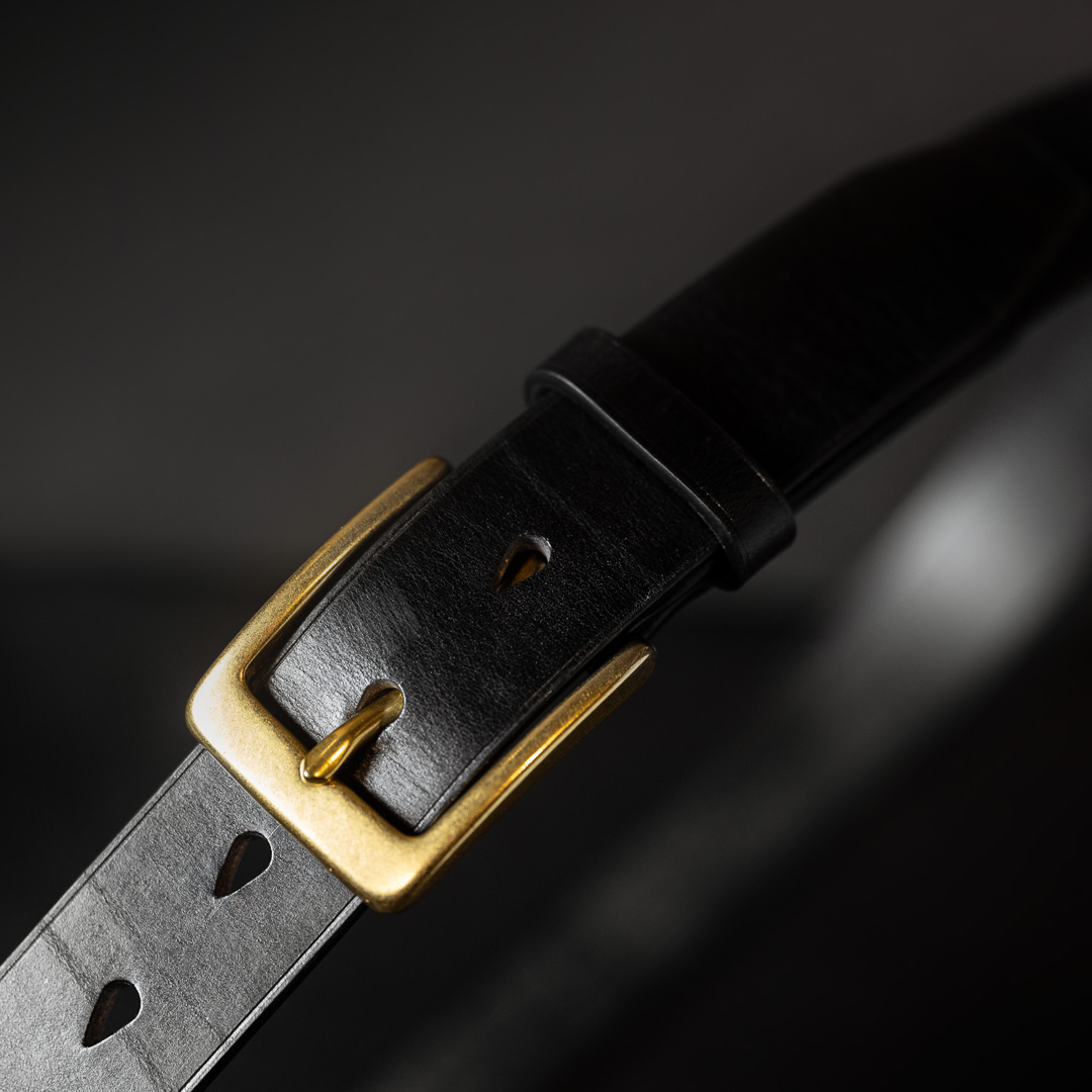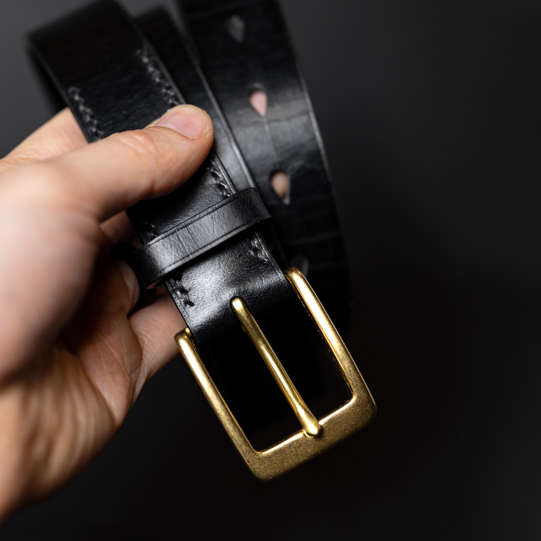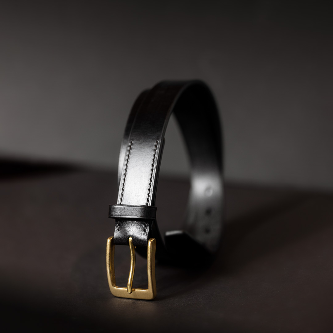 Everyday belt made of wax-coated bridle leather with refined details: painted and creased edges, hand-stitching, and tear drop belt holes, providing a touch of sophistication for daily wear.