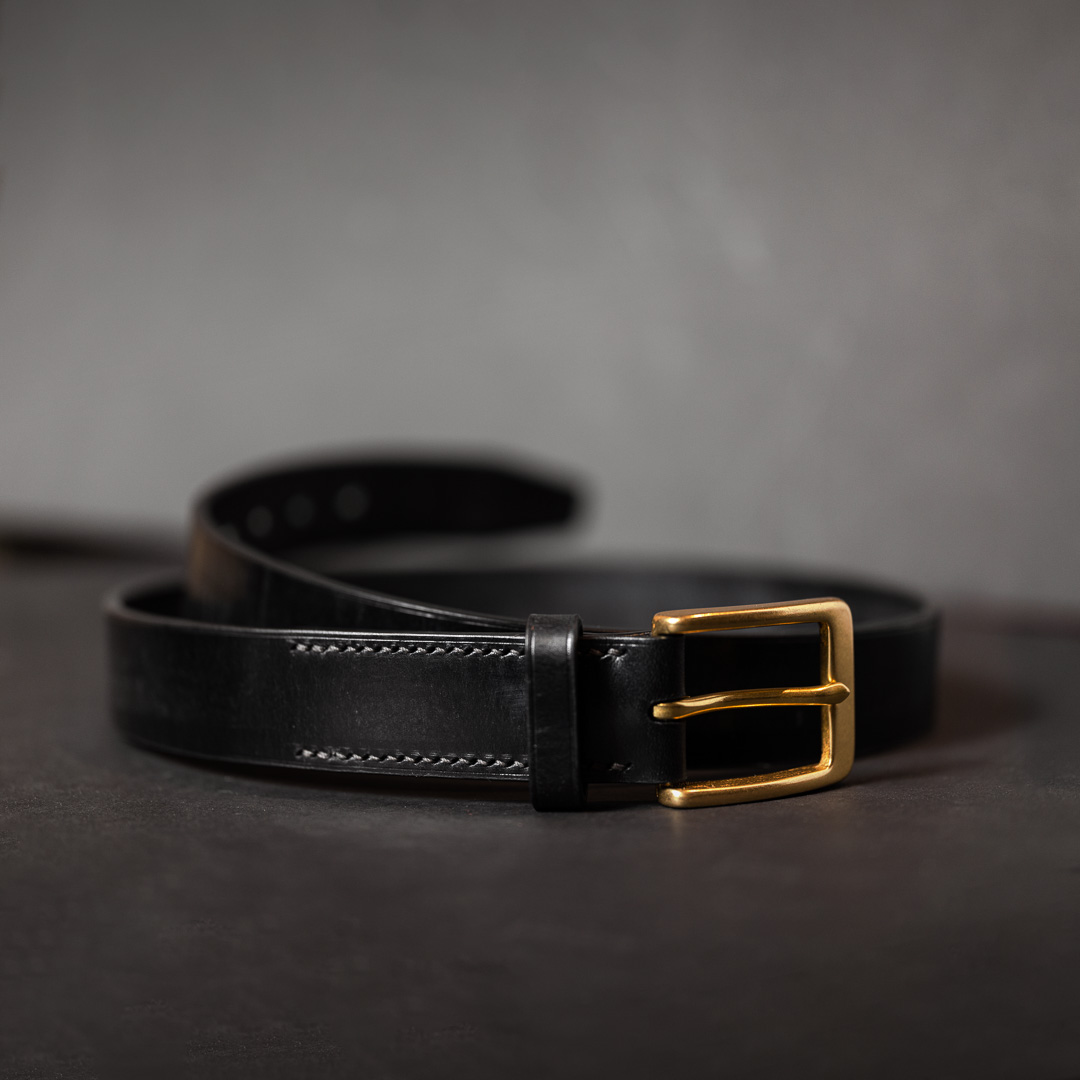 A versatile, refined everyday belt. Wax-coated bridle leather, solid brass buckle and meticulously hand crafted details: edge paint, crease, stitching and teardrop holes.