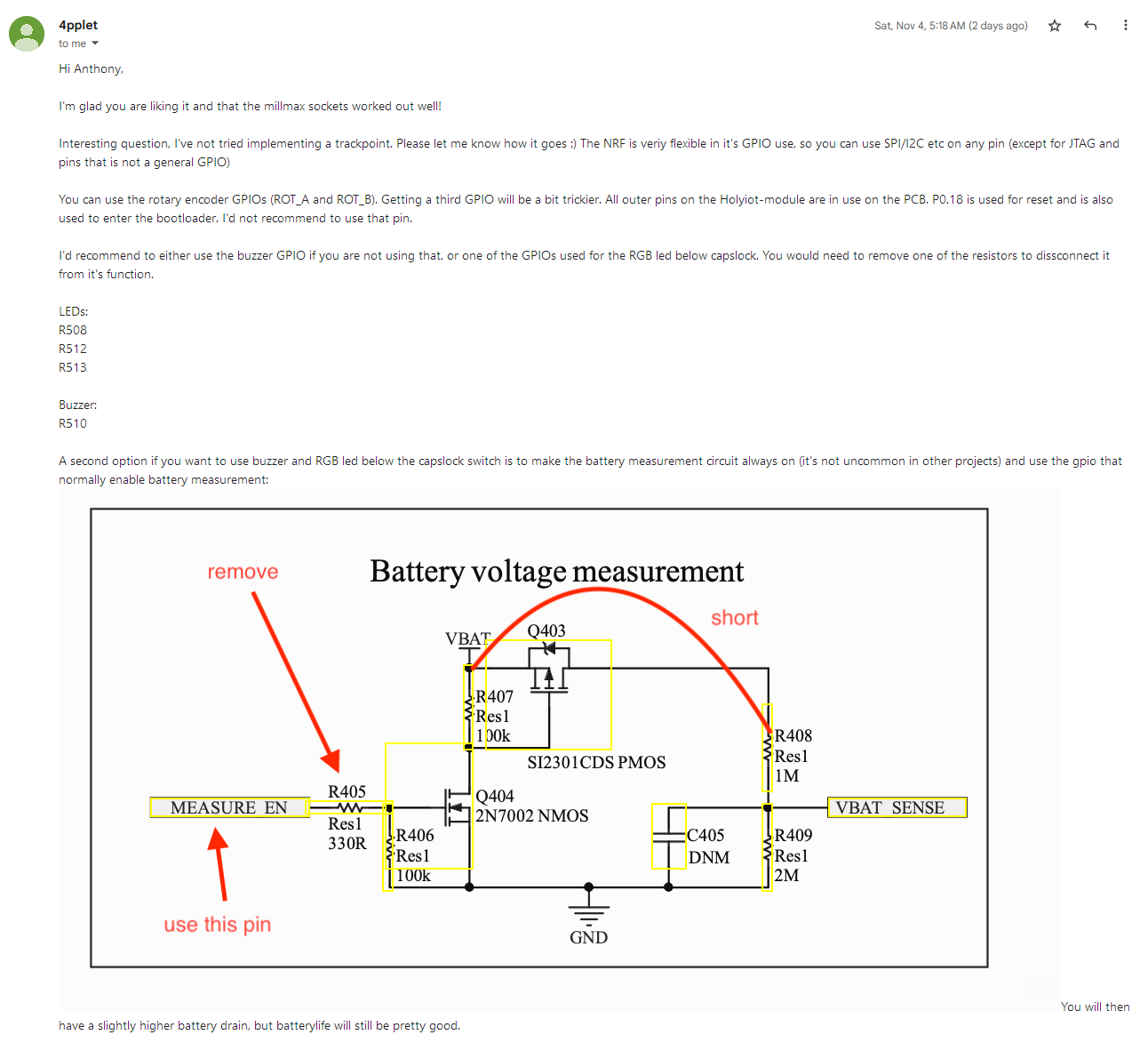 While it is generally possible to integrate a pointing device with the MCU, there are not enough free accessible pins to do so. Three GPIO pins are needed. Since I will not be using a rotary encoder, ROT_A and ROT_B provide two pins. The third will need to be repurposed from another component. 4pplet recommends using the buzzer or caplock LED, however, modifications are necessary.
