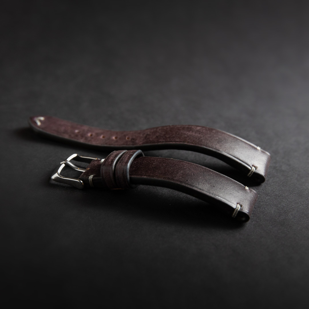 The leather used was a scrap piece of cordovan in a purple-ish brown hue. The color is unique as far as I have seen. Unfortuantely that also means that the strap can not be repeated.